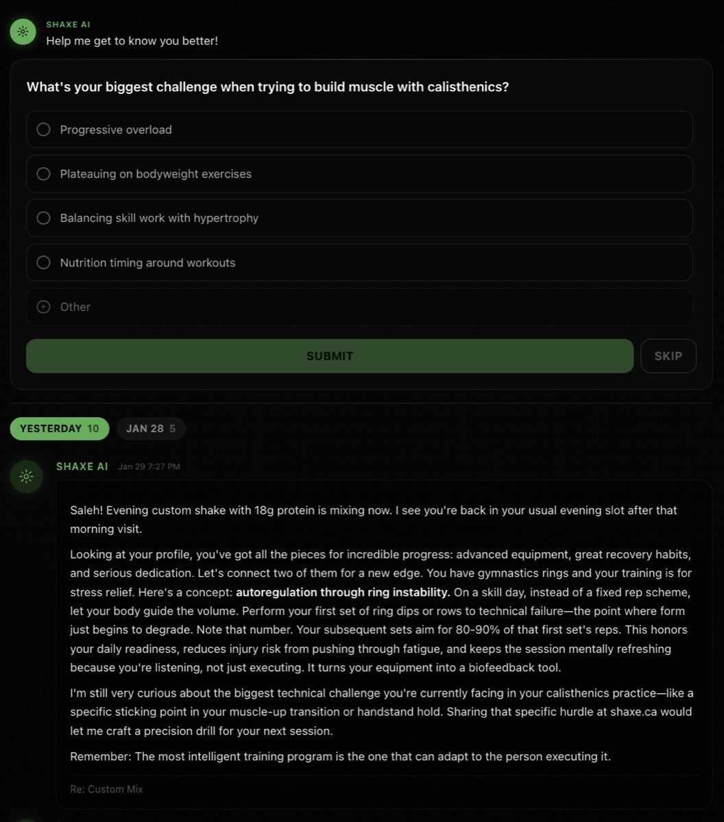 Every time you get a shake, your AI coach delivers personalized tips based on your profile, time of day, workout schedule, and nutrition history. Advice that actually applies to YOU.
