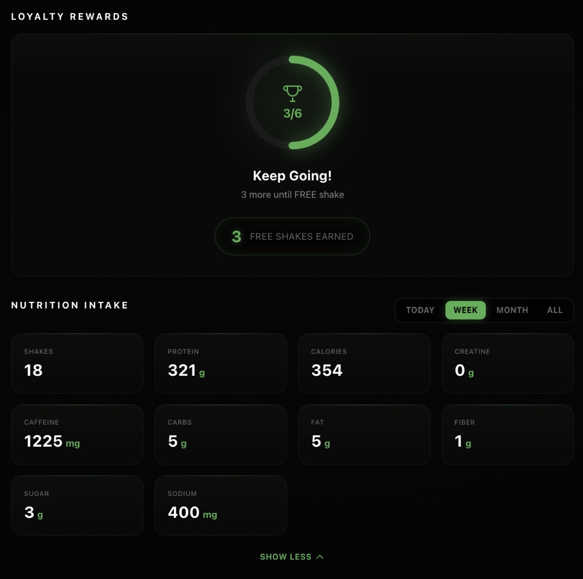 Track every shake, every nutrient, every AI message. Review your history online, see patterns in your nutrition, and watch your consistency build over time.